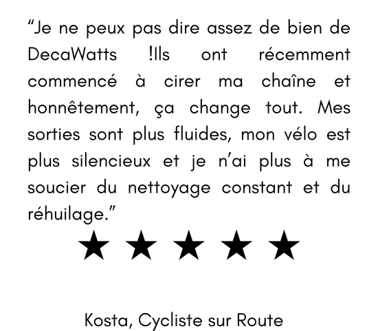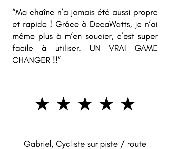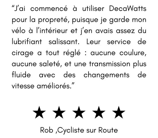 DecaWatts existe pour que les cyclistes n'aient plus jamais à se soucier de l'entretien de leur chaîne. Vous pouvez rouler comme vous l'entendez: intensément, souvent, sans vous préoccuper de la graisse, du bruit ou de l'usure prématurée; nous prenons soin discrètement de la pièce la plus importante.
