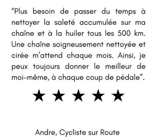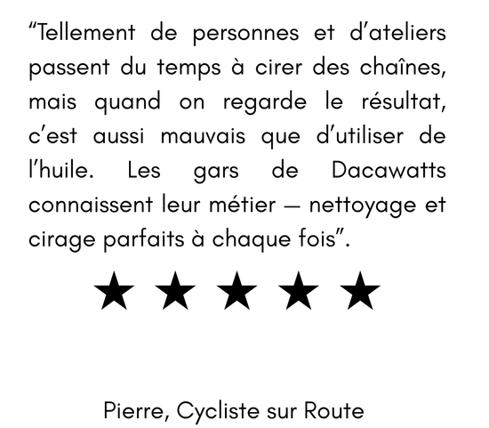 Même si vous cirez déjà votre chaîne vous-même, notre abonnement vous apportera un réel bénéfice. Chaque chaîne bénéficie de plus de deux heures de décontamination complète et d'un recirage professionnel, ce qui nous permet d'atteindre un niveau de précision, de propreté et de régularité impossible à obtenir à la maison ou dans un atelier de réparation de vélos classique. Toute trace de cire, de graisse et de contaminants est éliminée avant l'application de la cire neuve, garantissant ainsi une remise à neuf parfaite de la chaîne à chaque fois.